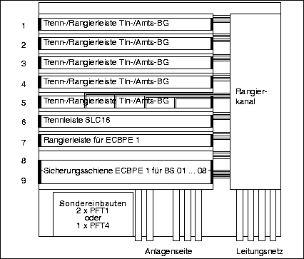 Die Sicherungsschiene ECBPE besitzt eine große Einbautiefe. Bei voller Bestückung des MDFU mit Trenn-/Rangierleisten kann es vorkommen, dass die Kabel dieser Leitungen durch die Sicherungsschiene beschädigt werden. In diesem Fall ist die Sicherungsschiene in einem der oberen Einbauplätze einzusetzen. |